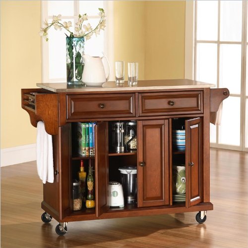 Finish:Classic Cherry Constructed of solid hardwood and wood veneers, this mobile kitchen cart is designed for longevity. The beautiful raised panel doors and drawer fronts provide the ultimate in style to dress up your kitchen. Style, function and quality make this mobile kitchen cart a wise addition to your home. Two deep drawers are great for anything from utensils to storage containers Behind the four doors, you will find threeadjustable shelves and an abundance of storage space for things that you prefer to be out of sight The heavy duty casters provide the ultimate in mobility When the cabinet is where you want it, simply engage the locking casters to prevent movement Stainless Steel Top Hand rubbed; Multi-Step finish Includes a spice rack wi