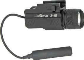 LEADWAVE Tac-Light. 3" overall. Black Type III anodized aircraft grade aluminum body. 3 watt red LED with 45 lumen output. Ergonomic pad cable switch. O-ring sealed. Uses one CR123A lithium battery. Fits on Picatinny rail mounting system.