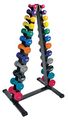 Neoprene/Vinyl Vertical Dumbbell Rack at Power Systems, Inc. Space-saving design stores and protects dumbbells in individual cradles. Holds a complete set of 1 lb. to 15 lb. dumbbells.